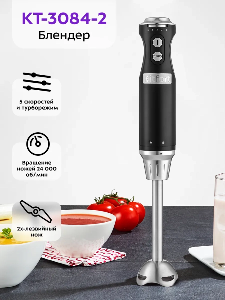 Погружной блендер Kitfort КТ-3084 предназначен для смешивания, взбивания, гомогенизации, приготовления фруктовых и фитнес-напитков, супов-пюре, соусов, муссов, молочных коктейлей, детского питания, а также для замеса жидкого теста. Блендер оснащен пятью скоростями работы с турборежимом и надежным двигателем, рассчитанным на длительный срок эксплуатации. Нож блендера выполнен из нержавеющей стали, что обеспечивает долгий срок службы. Насадка-блендер легко снимается с моторного блока, поэтому уход за устройством не составит труда. Благодаря компактным размерам погружной блендер KT-3084 не займет много места на вашей кухне. Устройство очень удобно в использовании - достаточно погрузить насадку-блендер в емкость с ингредиентами и нажать на нужную кнопку скорости. Блендер поможет смешать ингредиенты как для маленькой кружки смузи, так и для большой кастрюли крем-супа. Использование погружного блендера позволяет непрерывно наблюдать за процессом приготовления, благодаря чему вы всегда будете знать, в какой момент остановить смешивание для достижения желаемой консистенции блюда или напитка.