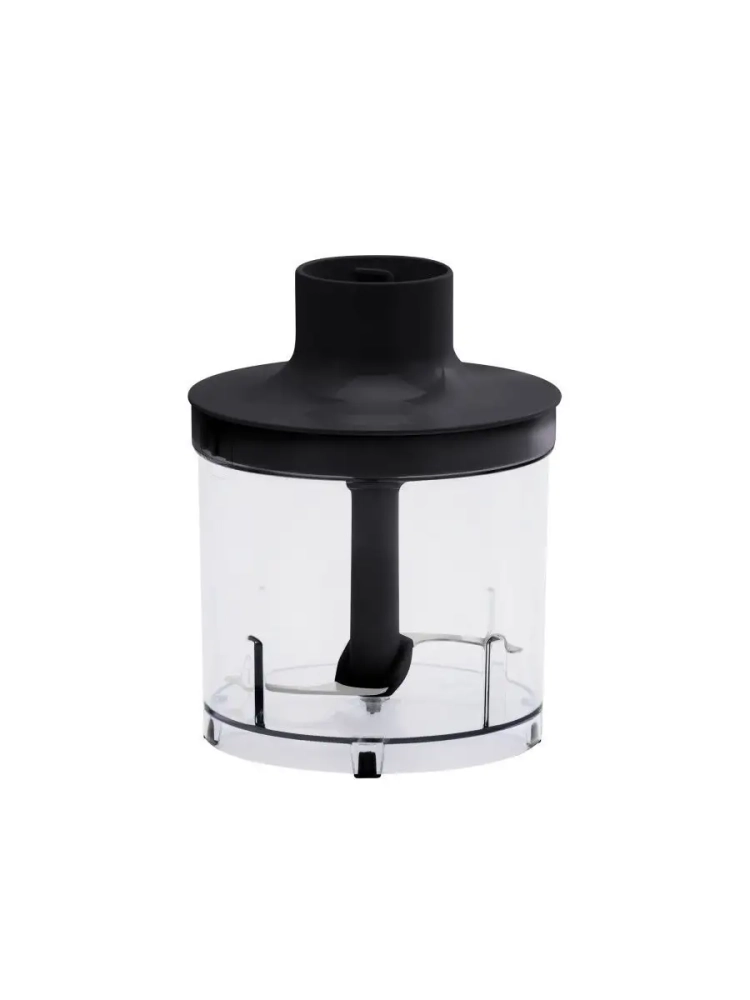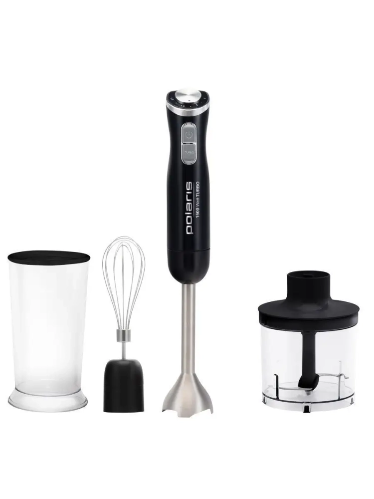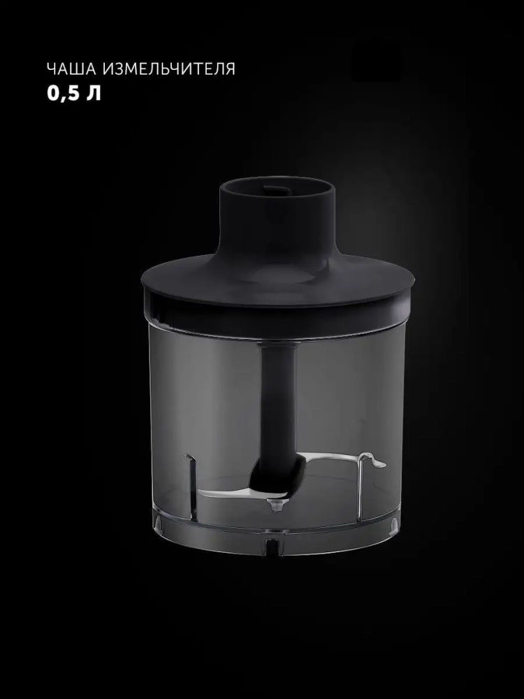 Измельчительная чаша 0,5 литра. Мерный стакан с крышкой объемом 0,7 литра. Насадка блендера из нержавеющей стали. Венчик для взбивания из нержавеющей стали.