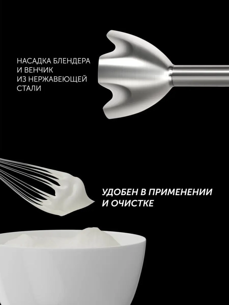 Практичность: Насадки блендера и венчик из нержавеющей стали, чаша измельчителя объемом 0,5 л и мерный стакан объемом 0,6 л легко моются и долговечны.