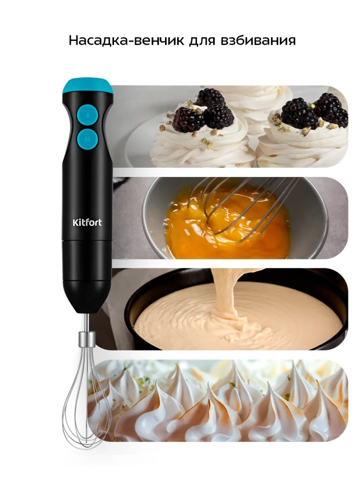 Погружной блендер идеально подходит для приготовления смузи, супов-пюре, соусов, муссов, молочных коктейлей и детского питания. Он также справляется с замесом жидкого теста, что делает его универсальным инструментом для любой кухни. В комплекте идет венчик, который позволяет взбивать сливки, яичные белки и готовить бисквиты и десерты из готовых смесей.