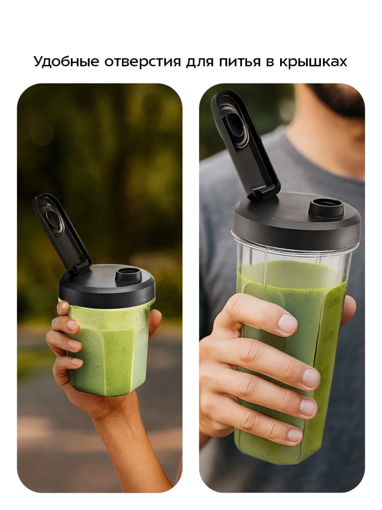 В комплекте есть чаша блендера емкостью 800 мл, две чаши Shake & Take емкостью 600 мл и две чаши Shake & Take емкостью 300 мл.