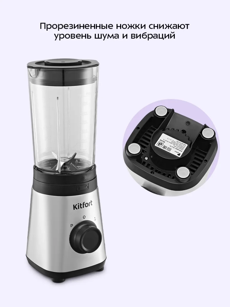 Для обеспечения безопасности блендер может работать только с установленной чашей. Прорезиненные ножки снижают уровень шума и вибраций при работе. Блендер оснащен 2 скоростями и импульсным режимом. В импульсном режиме блендер работает с максимальной скоростью, пока вы удерживаете регулятор.