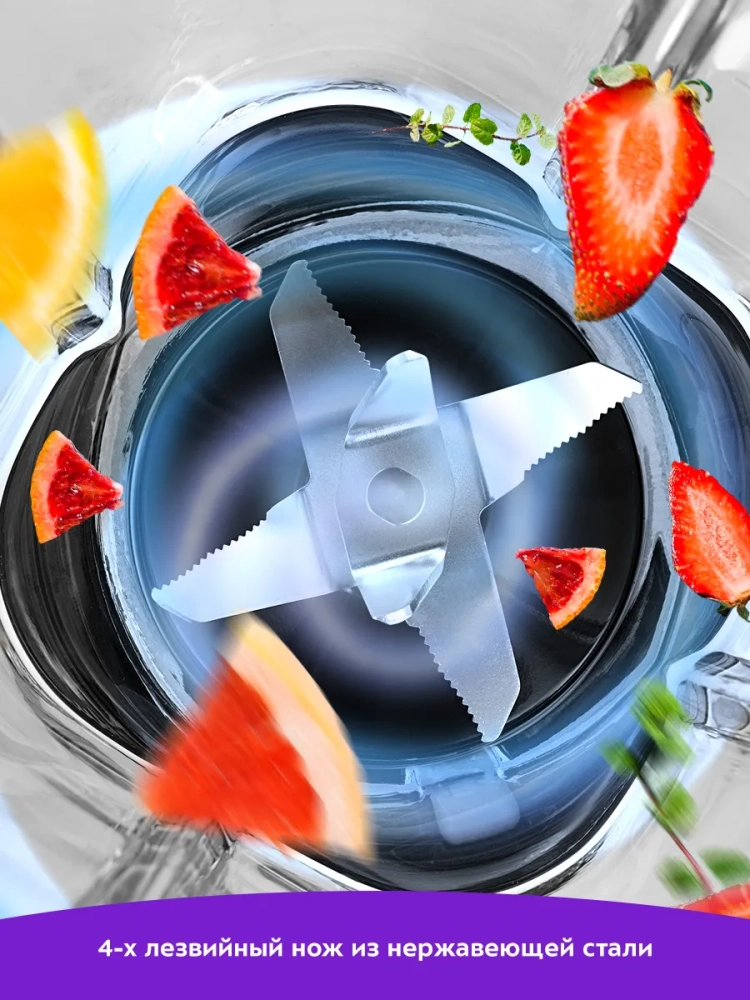 Блендер оснащен надежным двигателем мощностью 1250 Вт и ножами из нержавеющей стали, что обеспечивает долгий срок службы.