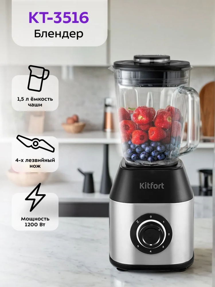 Блендер Kitfort КТ-3516 предназначен для приготовления пюре, взбивания, измельчения, смешивания различных продуктов и колки льда. С его помощью легко можно приготовить фруктовый и фитнес-напиток, молочный коктейль, смузи, мусс, суп-пюре, соус, детское питание и многое другое.