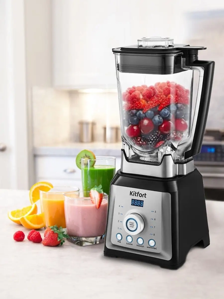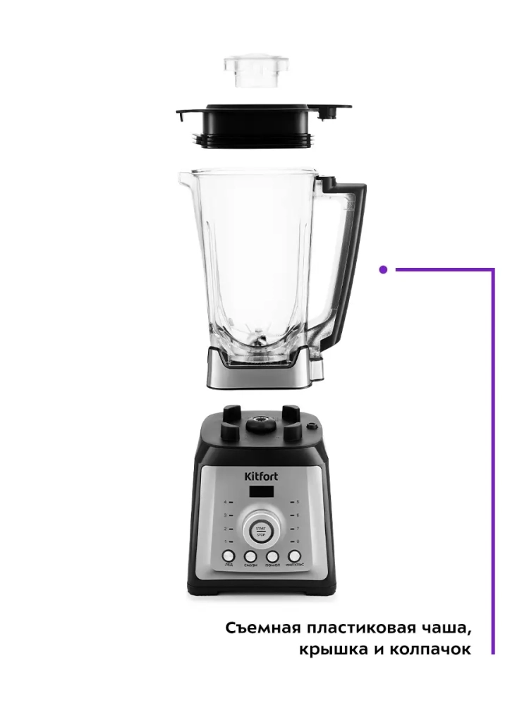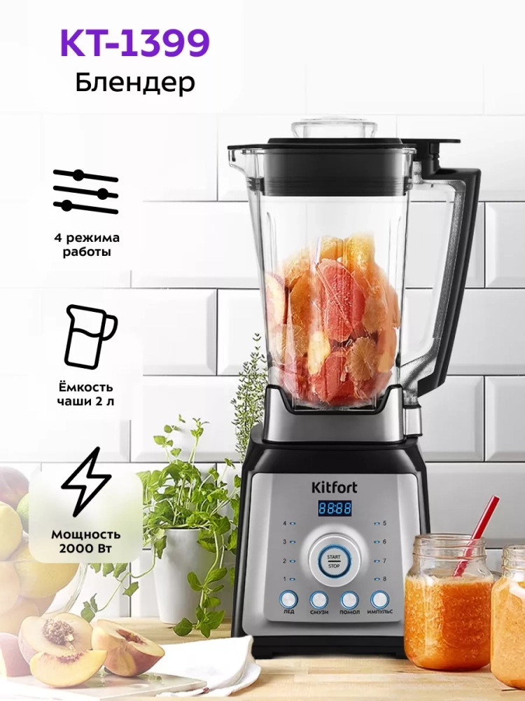 Блендер Kitfort КТ-1399 с кнопочным управлением предназначен для приготовления пюре, взбивания, измельчения и смешивания. Прибор идеально подходит для смешивания фруктовых напитков, молочных коктейлей, супов-пюре, соусов и детского питания. В модели есть специальные программы, предназначенные для приготовления смузи, колки льда, измельчения, а также импульсный режим. Есть возможность выбрать скорость вращения лезвий. Блендер оснащен вместительной пластиковой чашей с мерной шкалой объемом 2 литра, в крышке которой есть отверстие, закрываемое колпачком, для добавления ингредиентов непосредственно во время работы. В комплекте к блендеру идет толкатель, который может понадобиться при измельчении твердых ингредиентов. У блендера есть защита от включения без чаши. Блендер оснащен надежным двигателем мощностью 2000 Вт, рассчитанным на длительный срок эксплуатации. 8 лезвий блендера выполнены из нержавеющей стали и обеспечивают долгий срок службы.