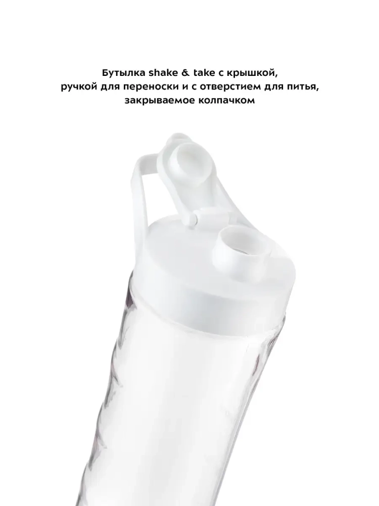 Портативная бутылка Shake & Take емкостью 600 мл с мерной шкалой позволяет готовить протеиновые смеси и фитнес-напитки сразу в бутылке.