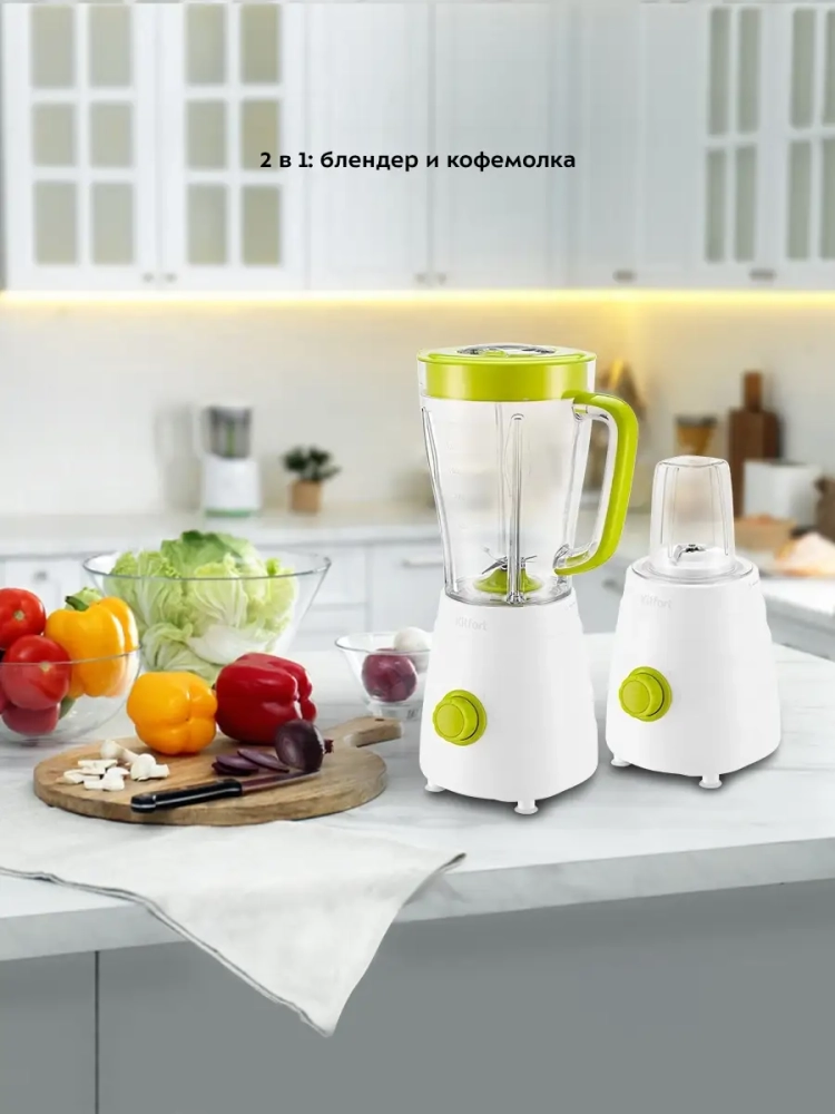 Блендеры предназначены для смешивания фруктовых и фитнес-напитков, молочных коктейлей, эмульсии, муссов, супов-пюре, соусов и детского питания. Блендер 2 в 1 Kitfort КТ-3054 выполняет функции не только блендера, но также измельчителя. Блендер оснащен регулятором скорости, который позволяет переключать скорость работы. Измельчитель позволит быстро измельчить мягкие продукты, такие как мясо, твердый сыр, помидоры, огурцы, перец, травы, ягоды и многое другое. Благодаря прозрачной чаше измельчителя удобно наблюдать за процессом и контролировать степень измельчения. Блендер Китфорт оснащен вместительной чашей емкостью 1,5 л с мерной шкалой. В крышке чаши есть специальное отверстие, закрываемое колпачком, для добавления ингредиентов непосредственно во время работы. Колпачок может использоваться как мерный стакан. Емкость мерного колпачка 50 мл. Для обеспечения безопасности блендер может работать только с установленной чашей на моторном блоке.