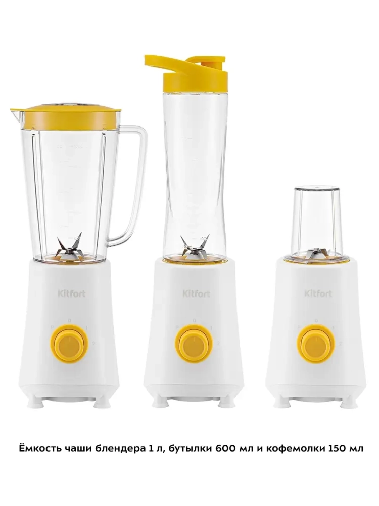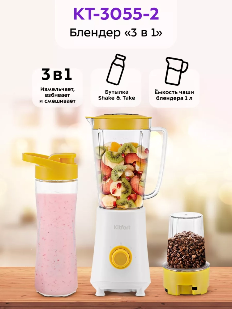 Блендер Kitfort КТ-3055 сочетает в себе функции трех устройств. Это стационарный блендер с функцией Shake & Take (шейк энд тэйк) и портативной бутылкой, а также кофемолка. В комплекте идет вместительная чаша с мерной шкалой емкостью 1 литр, в крышке которой есть отверстие, закрываемое колпачком, для добавления ингредиентов непосредственно во время работы. Колпачок емкостью в 20 мл, может использоваться как мерный стаканчик. Также в комплекте есть портативная бутылка, емкостью 600 мл, для использования функции Shake & Take, которая позволяет приготовлять протеиновые смеси и фитнес-напитки. Вы можете поместить бутылку в холодильник или взять с собой в спортзал. Бутылка влезает в подстаканник автомобиля. На крышке есть ручка для переноски и отверстие для питья, закрываемое колпачком. В комплекте также идет колба для охлаждения жидкости, которая будет держать напиток прохладным несколько часов. Для помола кофе в комплекте поставляется ротационная кофемолка.