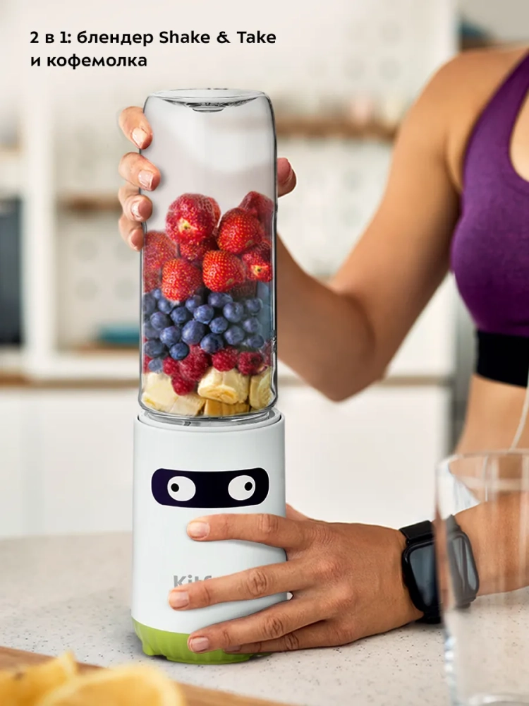 Блендер Shake & Take Kitfort КТ-3033 - устройство, которое с легкостью смешает коктейли, смузи, фруктовые и фитнес-напитки, эмульсии, муссы, соусы и детское питание. Для этого нужно заполнить ингредиентами бутылку и включить блендер. Включение блендера производится нажатием на бутылку, установленную на моторный блок. Преимуществами блендера являются привлекательный спортивный стиль, удобство в использовании, компактные размеры, многолезвийный нож из нержавеющей стали и две бутылки емкостью 300 мл с крышкой. Одна бутылка для смешивания коктейлей, а вторая для заваривания напитков. После приготовления смеси нет необходимости переливать содержимое: бутылку можно закрыть навинчивающейся крышкой. Вы можете поместить бутылку в холодильник или взять с собой в спортзал. Бутылка влезает в подстаканник автомобиля. В комплекте KT-3033 есть чаша кофемолки объемом 50 мл, в которой вы сможете перемолоть зерна кофе, специи и орехи.