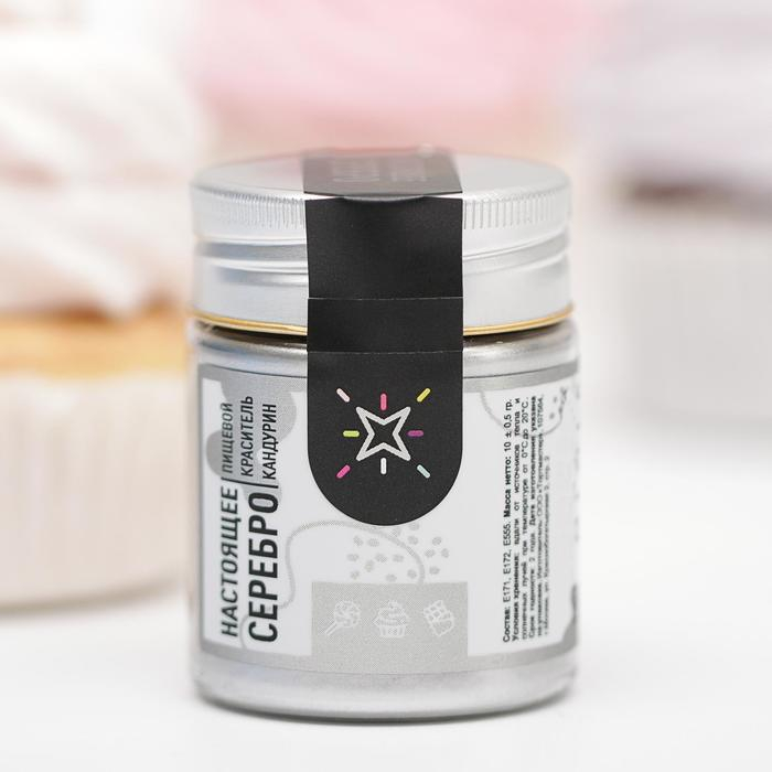 Кандурин MIXIE «Настоящее серебро» является биологически активным соединением из силиката или слюды – продуктов растительного происхождения, а также устойчив к воздействию температур, поэтому он не потеряет свой цвет и текстуру. Кандурин — плотный перламутровый краситель, который можно использовать для декора и поверхностного нанесения на все виды кондитерских изделий.
