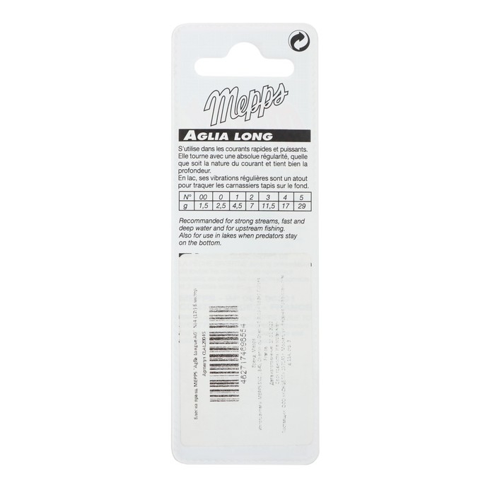 Блесна Mepps AGLIA в основном предназначена для водоемов со слабым течением, или «стоячей» водой. Благодаря своей превосходно выверенной механике, она начинает послушно вращаться, лишь только коснётся воды. Конус вращения адаптируется к силе течения, что позволяет ей создавать вибрации, наиболее привлекательные для хищников.