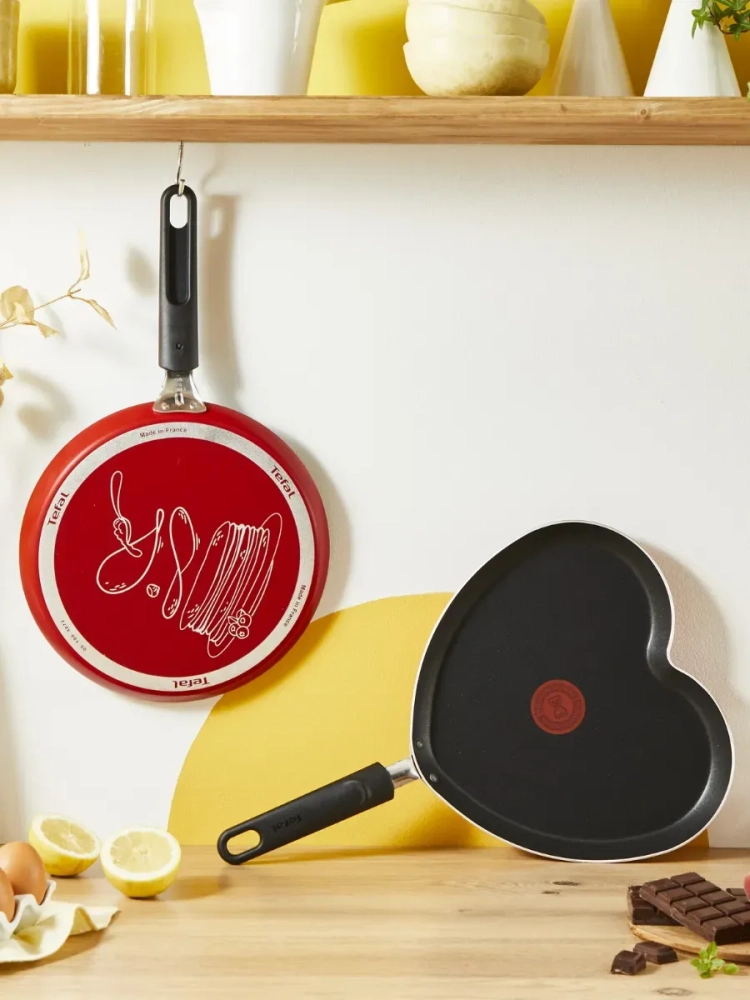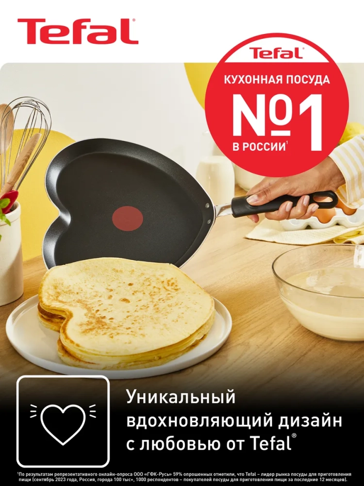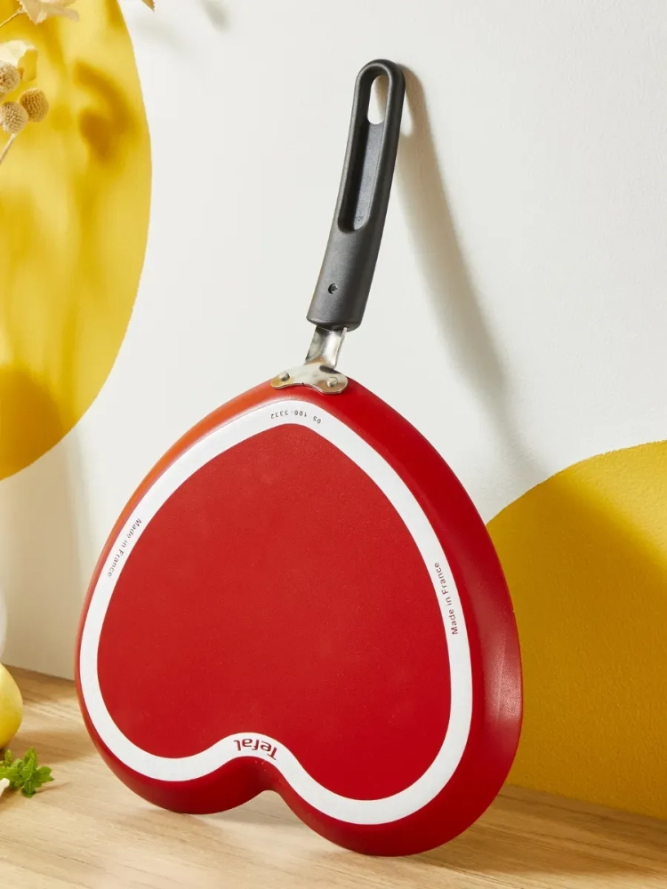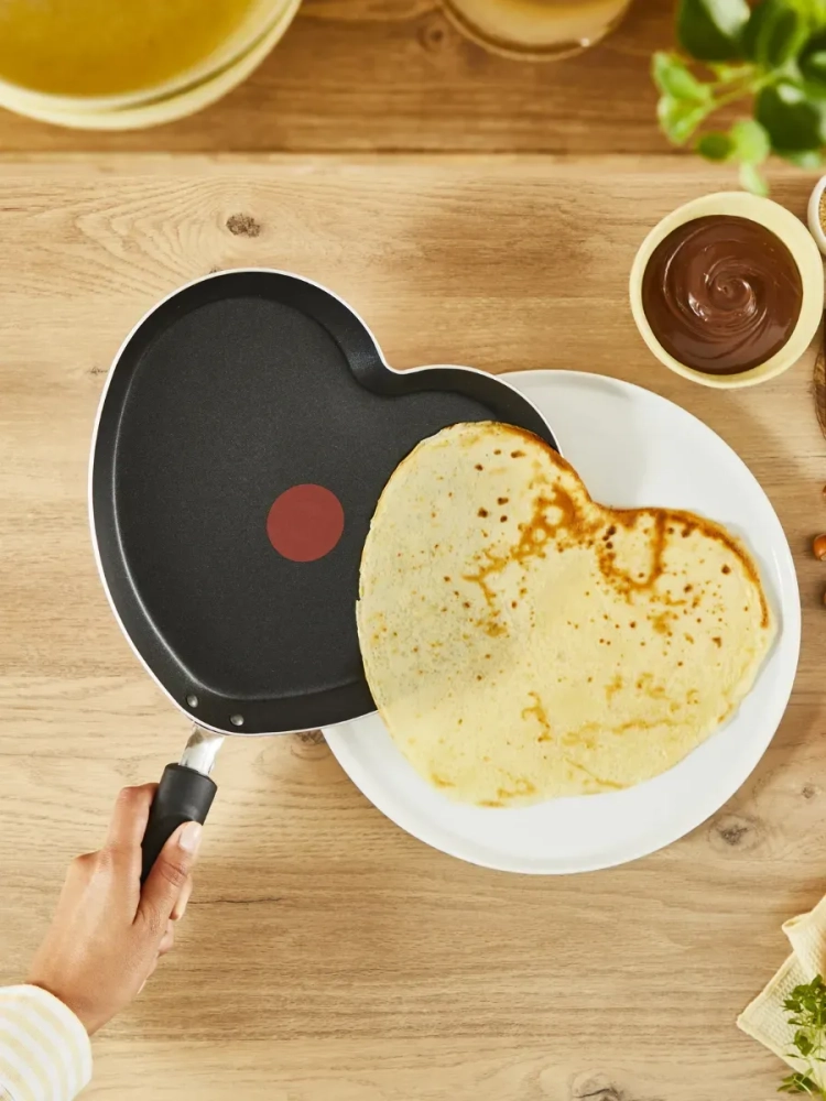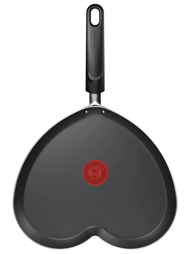 Блинная сковорода Tefal B0141002. Ничто так не сближает людей, как совместное застолье и домашние блинчики. Тонкие, пышные, ажурные, с припеком - на сковороде Tefal любые блины получаются безупречными! Благодаря инновационному антипригарному покрытию эта блинная сковорода в форме сердца делает невероятно легким и удобным переворачивание и подачу блинов на стол. Идеальные блинчики без труда соскальзывают со сковороды и сразу готовы к подаче вместе с любимой начинкой! Уникальный дизайн, стойкий к повреждениям. Яркий и красочный декор добавит уюта вашей кухне.