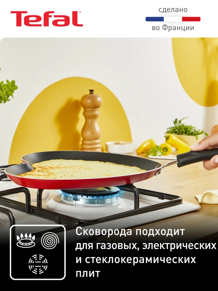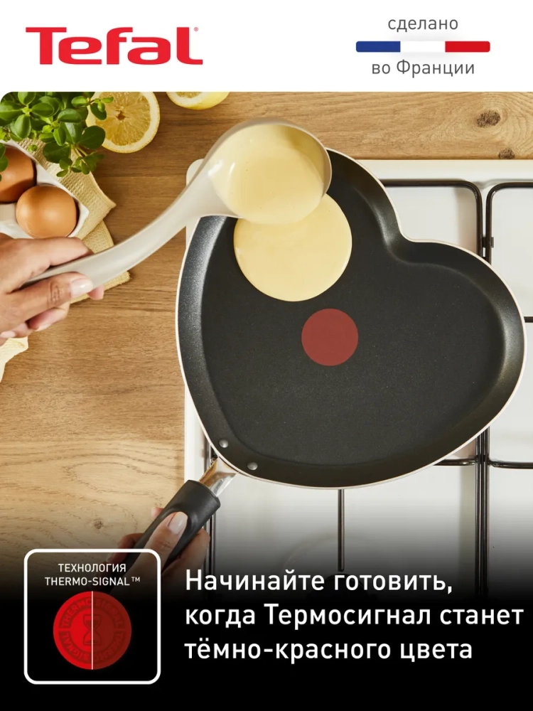 Индикатор Thermo-Signal меняет цвет, когда сковорода достигает идеальной температуры для начала приготовления. Местное производство позволяет объединять инновации, экспертные знания, высококачественные материалы и многолетний опыт Tefal в одном месте. Блинная сковорода совместима со всеми типами плит, кроме индукционных.