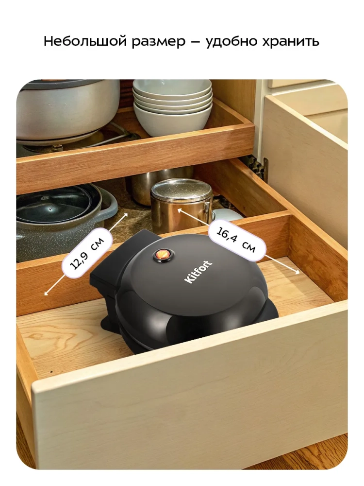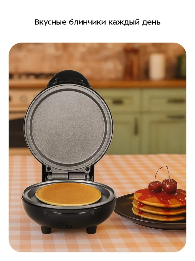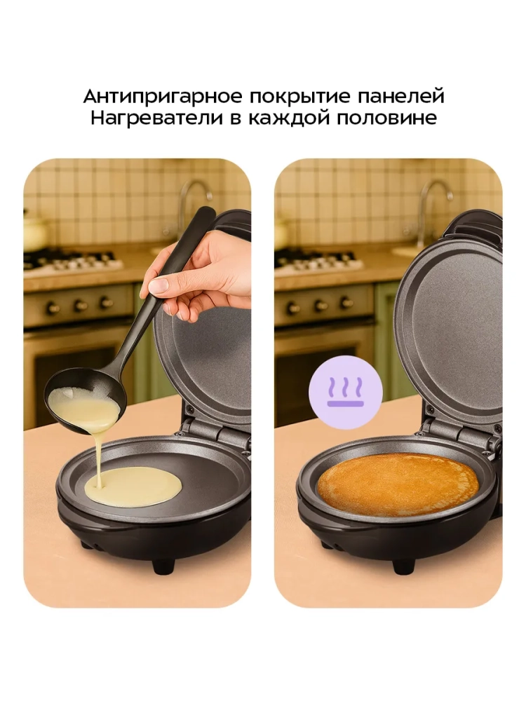 С помощью электрической блинницы Kitfort КТ-4628 вы сможете печь небольшие блинчики. Прибор рассчитан на приготовление одного блинчика за раз. С КТ-4628 вы сможете делать красивые десерты, подавая блинчики с мороженным, шоколадной пастой, джемом и фруктами.