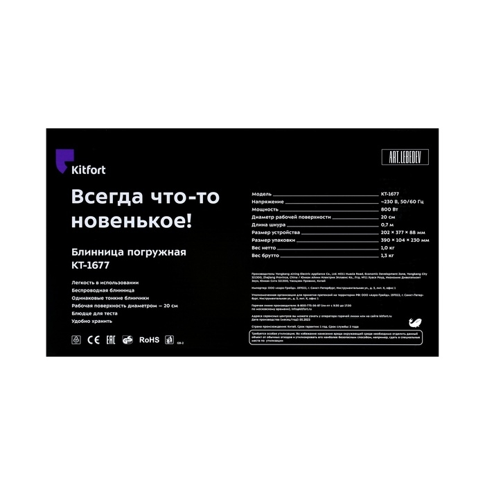 Блинница электрическая Kitfort КТ-1677, погружная, 800 Вт, d=20 см, чёрная