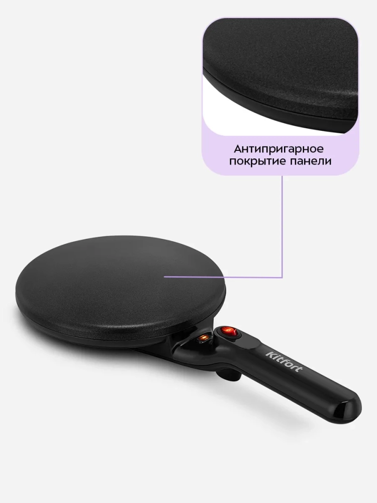 Блинница оснащена термостатом для поддержания постоянной температуры поверхности. Корпус блинницы выполнен из термостойкого пластика.