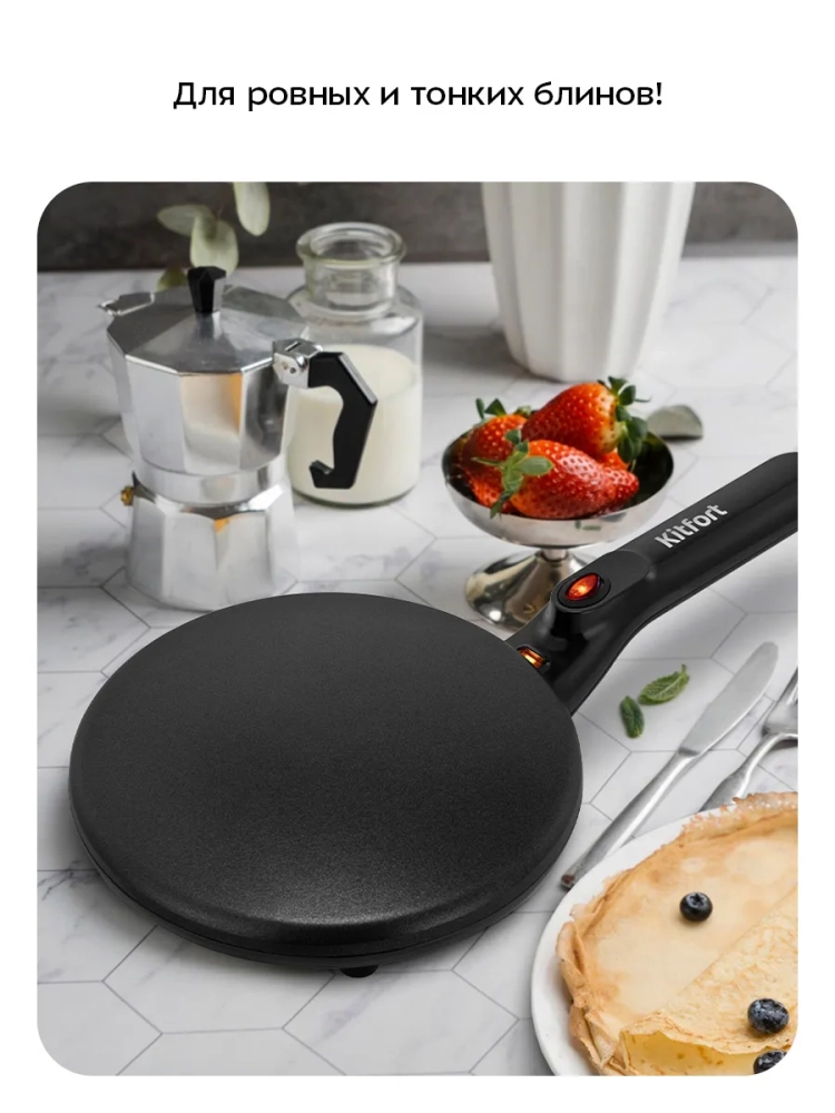 С помощью погружной блинницы Kitfort КТ-4695 можно испечь блины быстро и без лишних усилий. При использовании обычной сковороды или блинницы тесто наливается на них, а затем разравнивается по всей поверхности. При этом достаточно сложно получить тонкие ровные блины. Принцип нанесения теста на погружную блинницу совершенно иной: рабочая поверхность блинницы погружается в тесто на несколько секунд, а затем ставится на стол для дальнейшей жарки. При погружении блинницы на нее налипает тонкий слой теста, и блин получается с ровными краями и равномерной толщины.