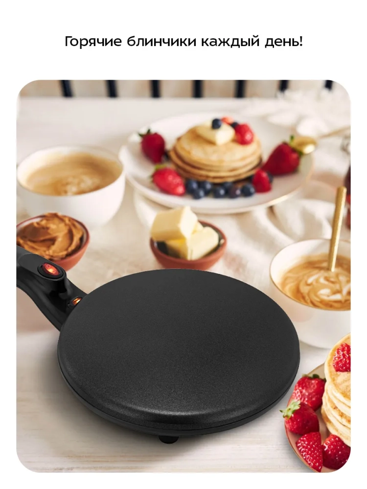 • ее не нужно ставить на плиту, поэтому можно печь блины на любой удобной ровной твердой поверхности, устойчивой к высоким температурам;