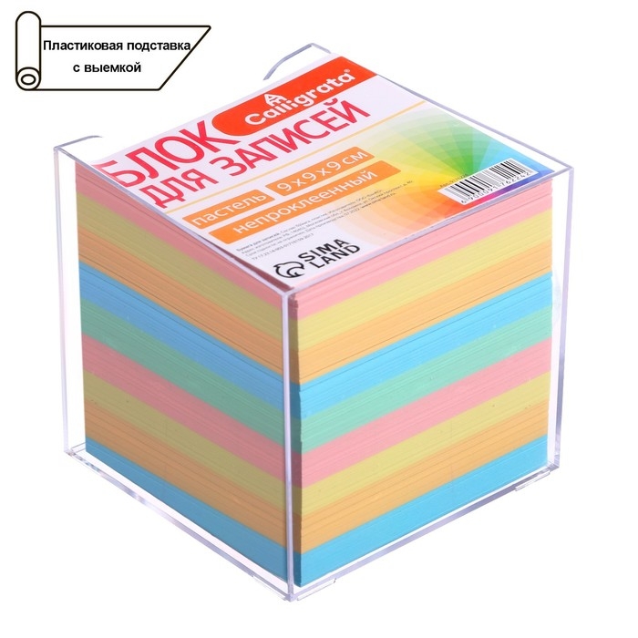 Блок бумаги для записей, 9х9х9, цветная пастель 80г/м2, в пластиковом прозрачном боксе