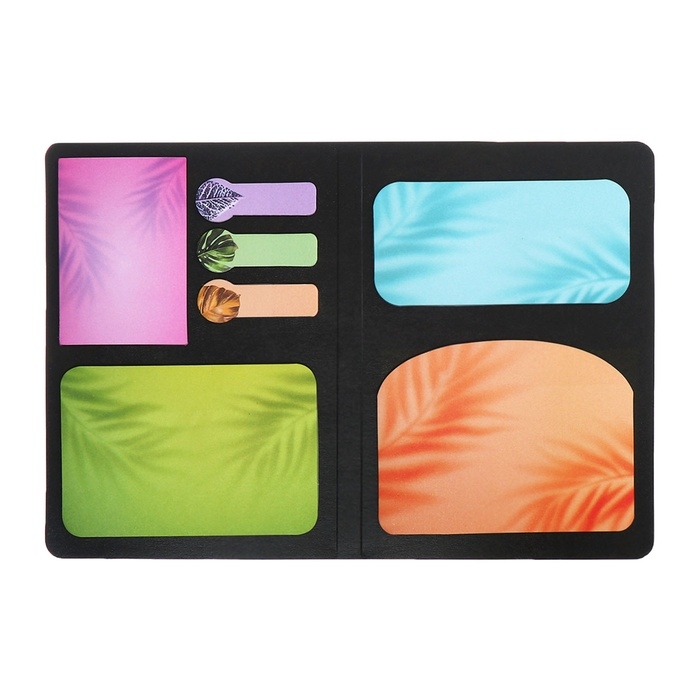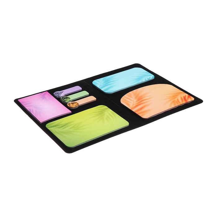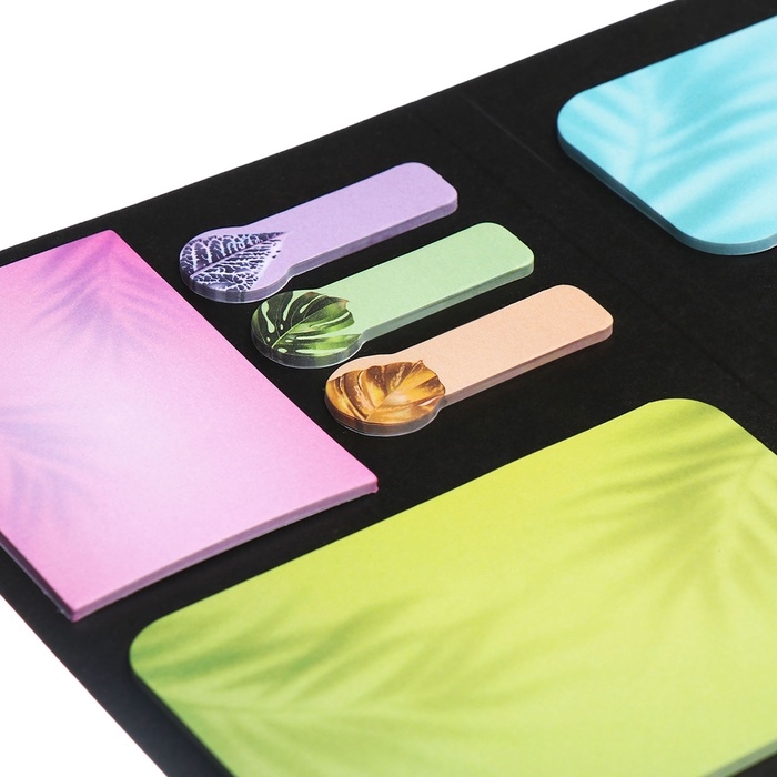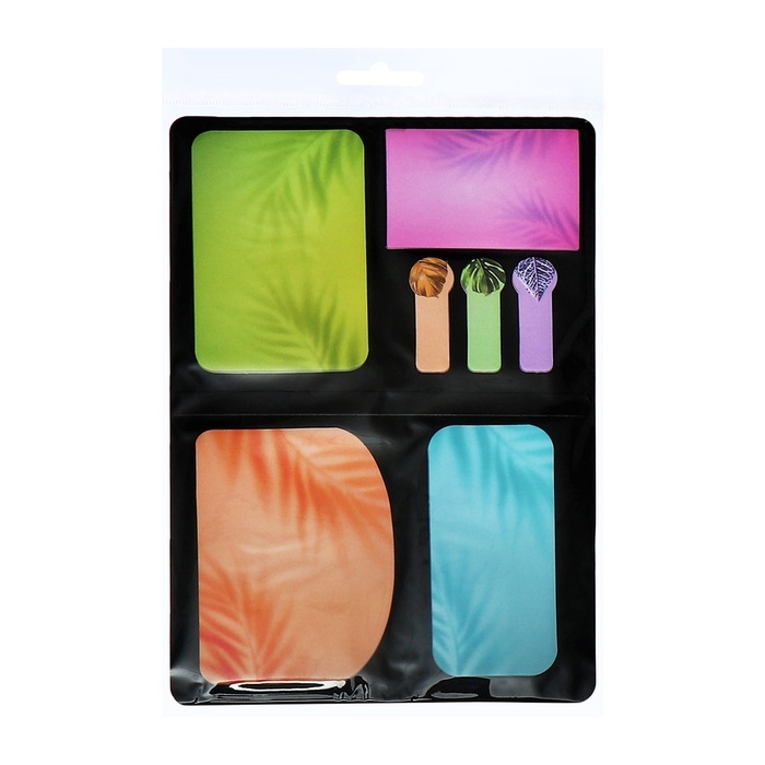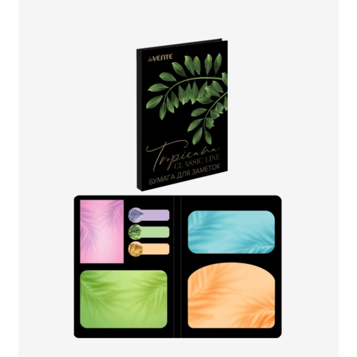 Набор клейкой бумаги для заметок "deVENTE. Tropicana" 115x158 мм, размер заметок: 16x45 мм, 48x70 мм, 46x96 мм, 64x96 мм и 72x96 мм, 7x20 листов, офсет 80 г/м², печать 4+0, ассорти форм, 7 дизайнов, в картонном блистере и пластиковом пакете