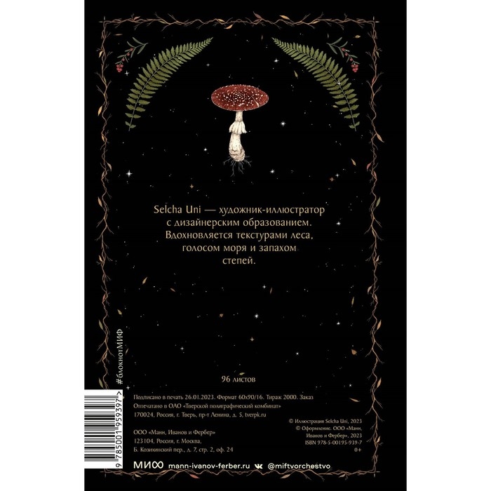 Блокнот в стиле cosy darkness в твёрдом переплёте на плотной линованной бумаге. Природные сказочные мотивы и волшебство от популярного иллюстратора Selcha Uni. 192 страницы с рисованными декоративными элементами на полях.