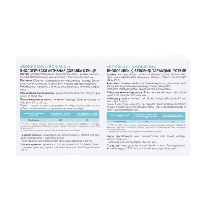 Бонисан — это биологически активная добавка (БАД), предназначенная для облегчения симптомов климакса у женщин старше 40 лет. В состав препарата входят изофлавоны сои, микрокристаллическая целлюлоза, желатин, кальция стеарат.