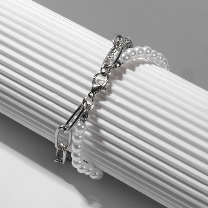Браслет жемчуг «Замок» шар №8, цвет бело-серый в серебре, L=16 см