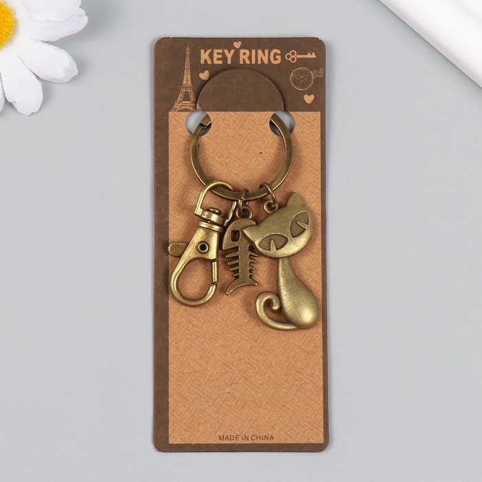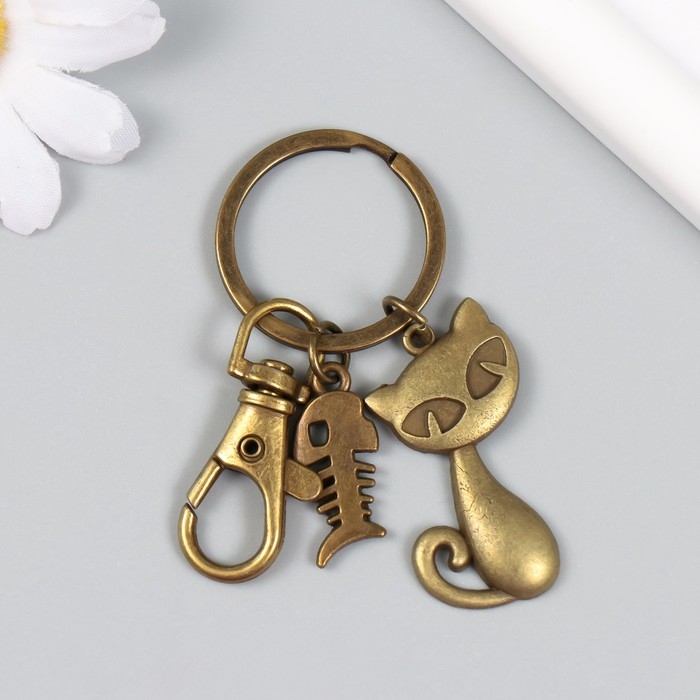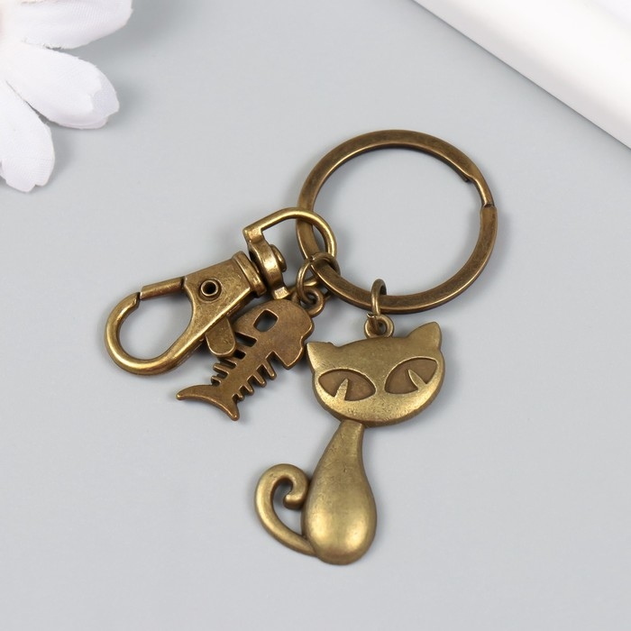 Брелок металл с карабином "Котик и рыбий скелет" бронза 7 см