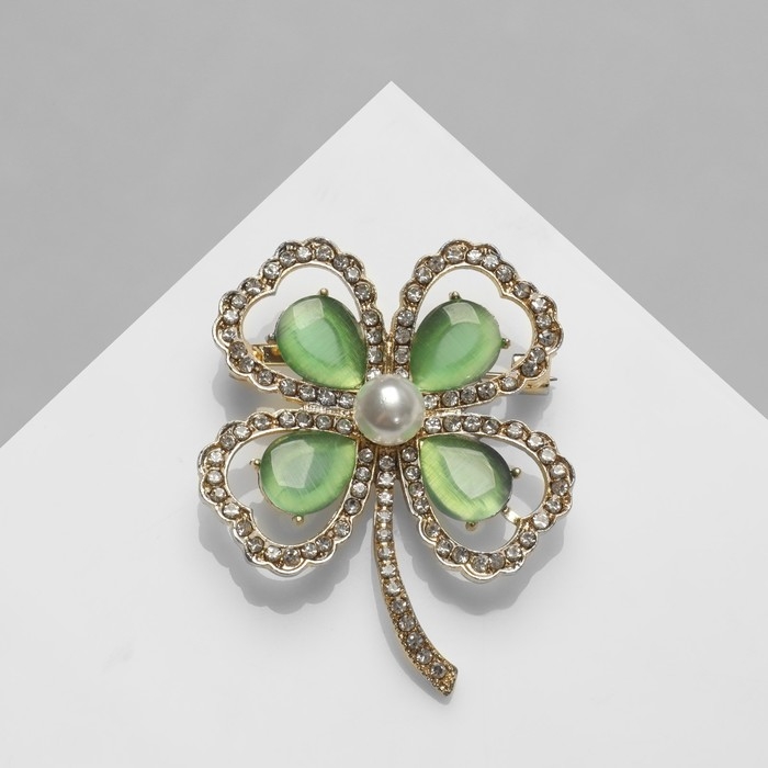 Брошь «Цветок» клевер с жемчугом, цвет бело-зелёный в золоте