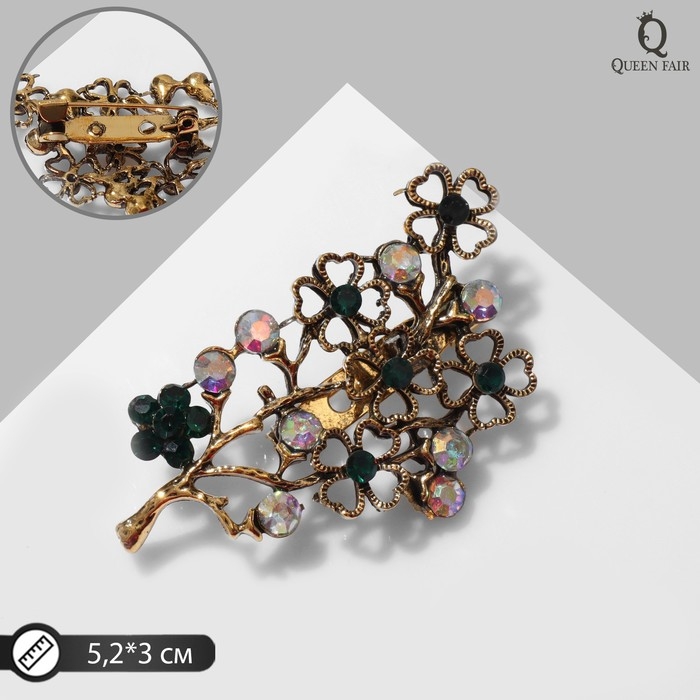 Брошь «Цветы» на веточке, цвет изумрудно-радужный в чернёном золоте