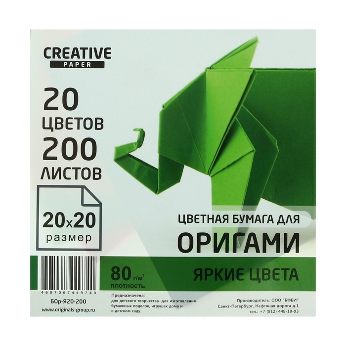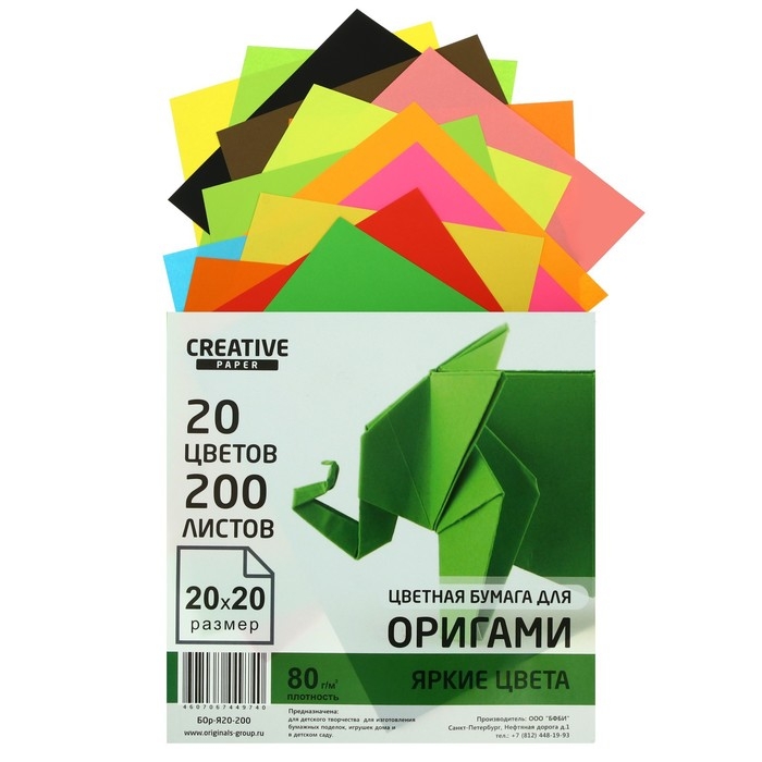 Бумага цветная для оригами и аппликаций 20 х 20 см, 200 листов CREATIVE Яркие цвета, 20 цветов, 80 г/м2