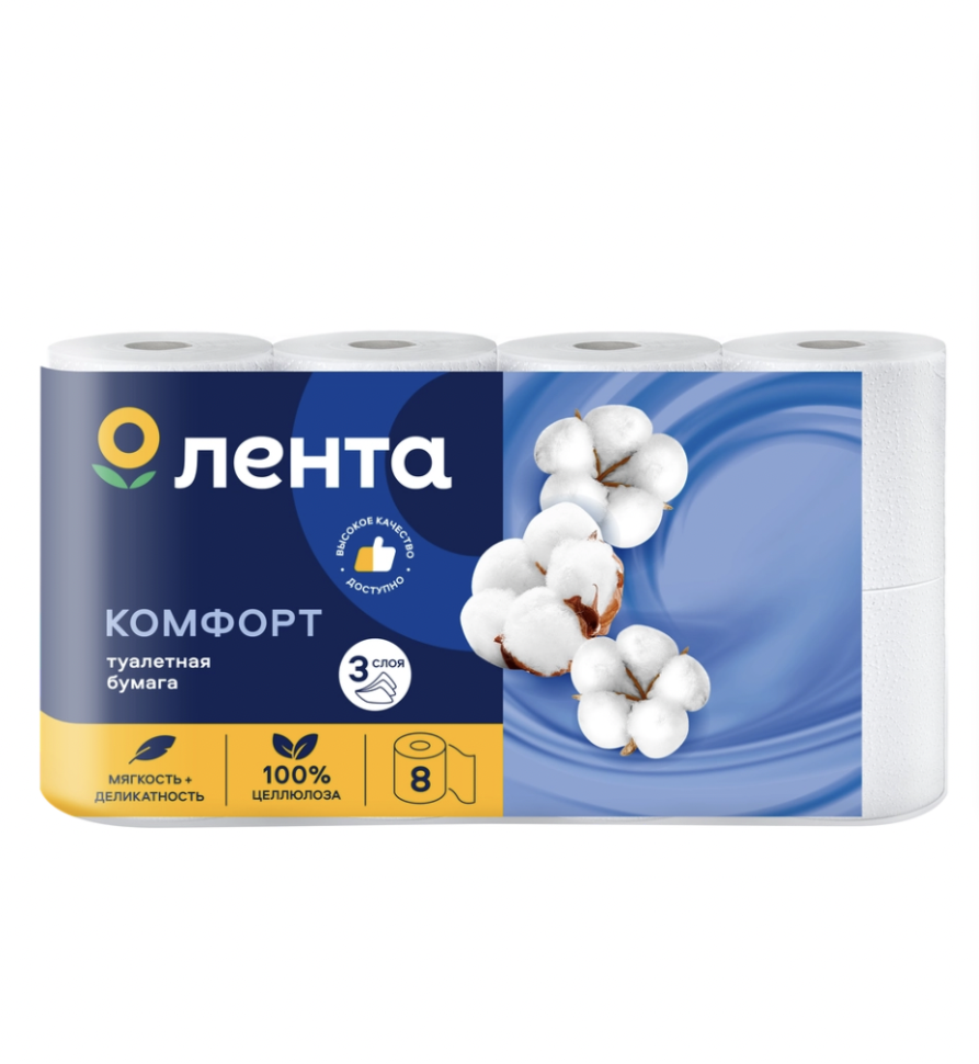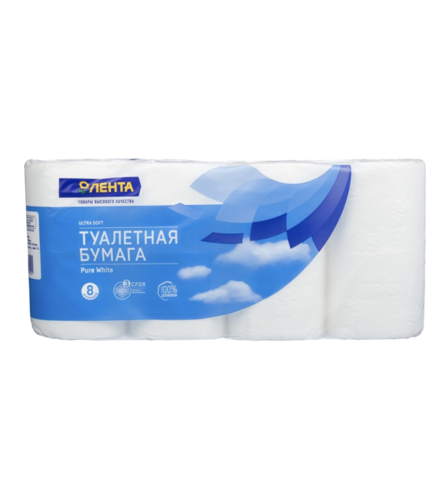 Бумага туалетная ЛЕНТА 3 слоя белая, 8шт