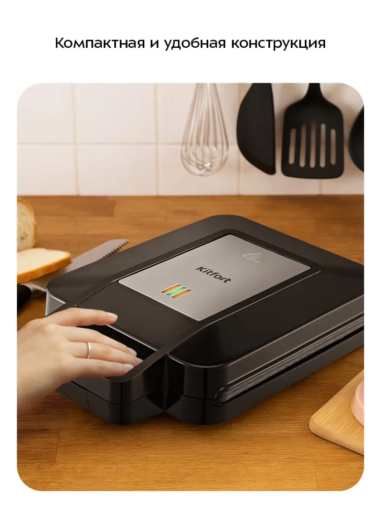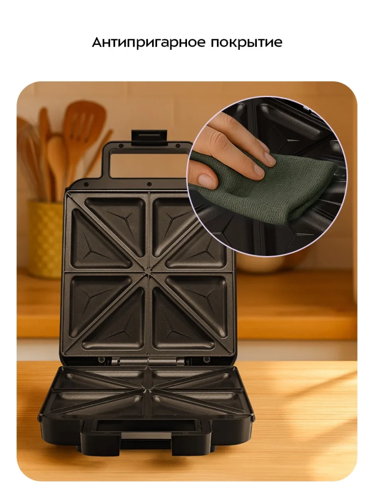 Бутербродница оснащена термостатом для поддержания температуры панелей. Отсек на нижней части корпуса предназначен для удобного хранения шнура питания. Фиксатор на ручке удерживает крышку бутербродницы в закрытом состоянии, что делает готовку, транспортировку и хранение более удобными.