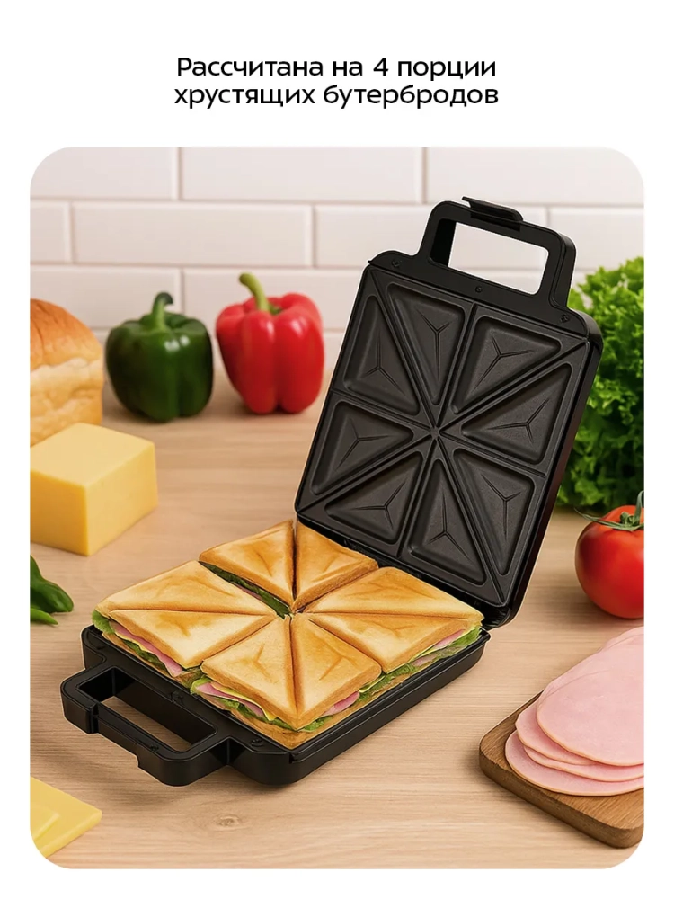 Электрическая бутербродница Kitfort KT-4609 поможет приготовить самые разнообразные бутерброды. В бутерброднице можно готовить не только привычные бутерброды с ветчиной и сыром, но и сладкие бутерброды, например, с яблоками и творогом, пирожки из слоеного теста с разнообразными начинками, драники и многое другое. Бутербродница KT-4609 рассчитана на 4 порции бутербродов из хлеба для тостов.