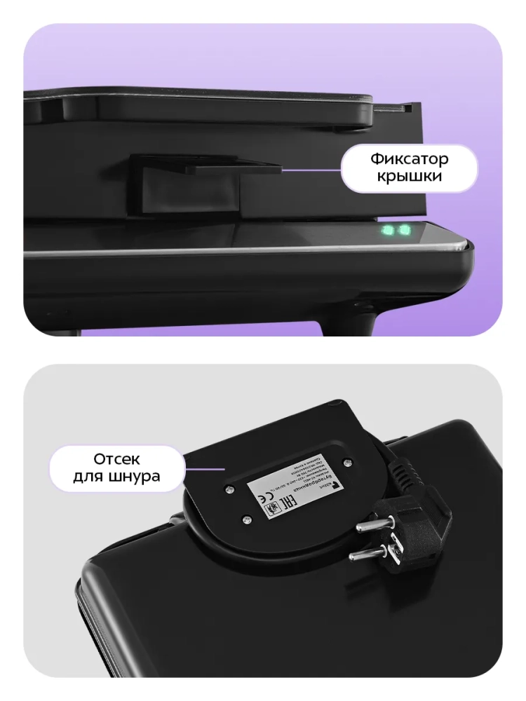Бутербродница оснащена термостатом для поддержания температуры панелей. Отсек на нижней части корпуса предназначен для удобного хранения шнура питания. Фиксатор на ручке удерживает крышку бутербродницы в закрытом состоянии, что делает готовку, транспортировку и хранение более удобными.