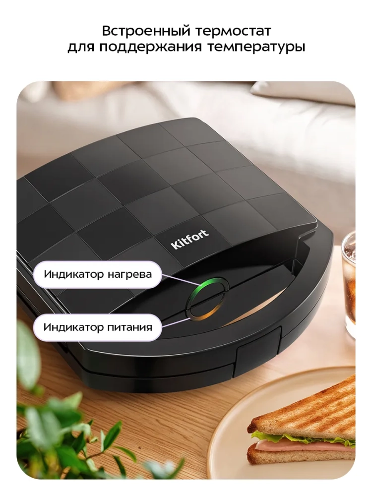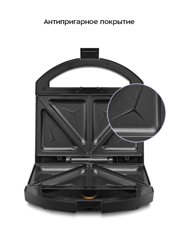Бутербродница оснащена термостатом для поддержания температуры панелей. Отсек на нижней части корпуса предназначен для удобного хранения шнура питания. Фиксатор на ручке удерживает крышку бутербродницы в закрытом состоянии, что делает готовку, транспортировку и хранение более удобными.