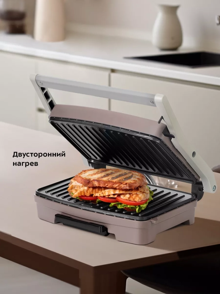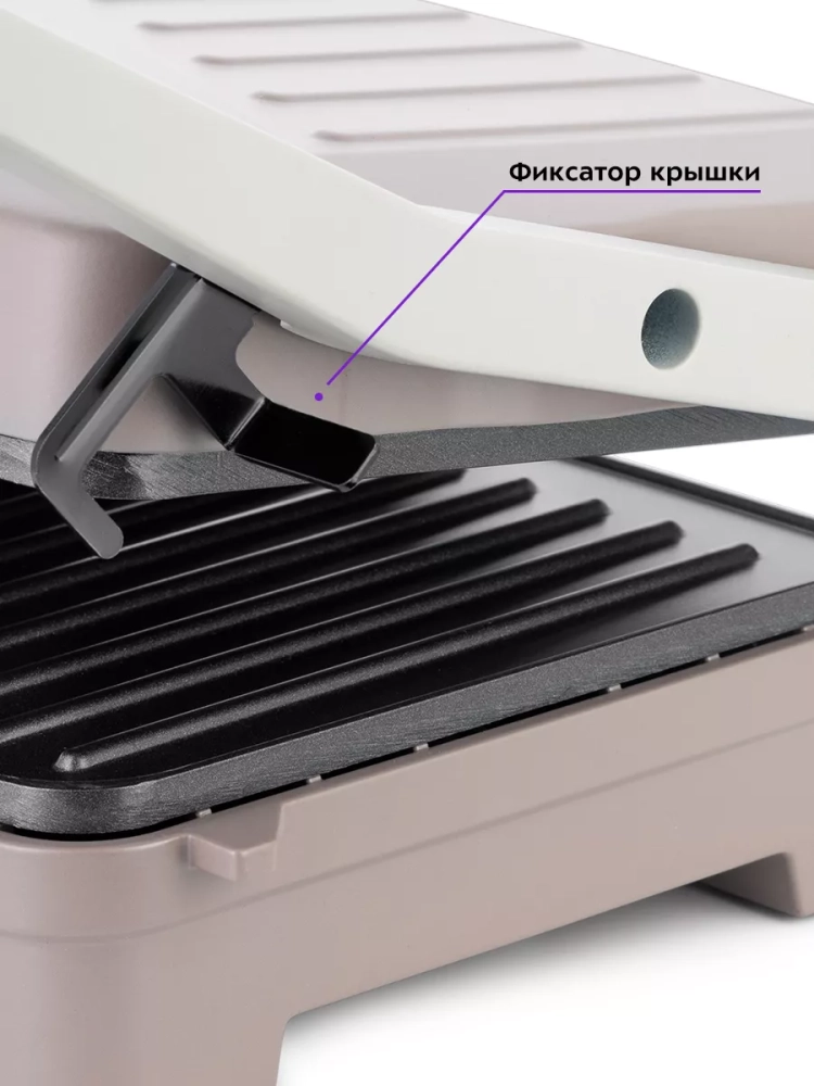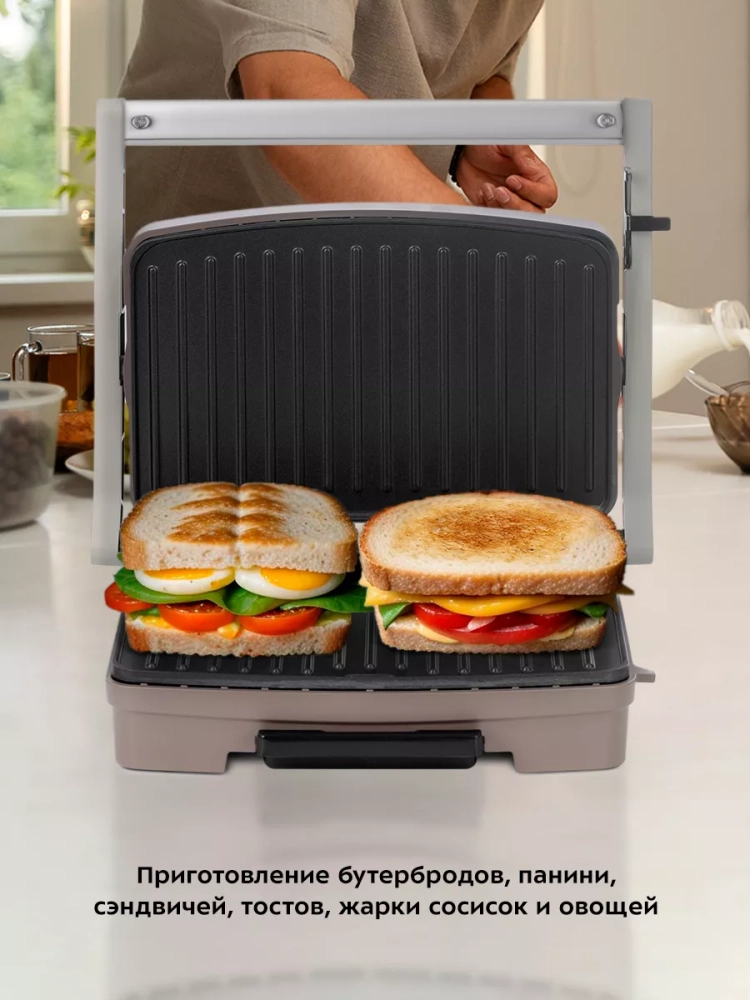 Бутербродница оснащена термостатом для поддержания температуры панелей, а также индикаторами питания и нагрева. Специальный фиксатор сбоку гриля удерживает крышку в закрытом состоянии, что делает готовку, транспортировку и хранение более удобными.
