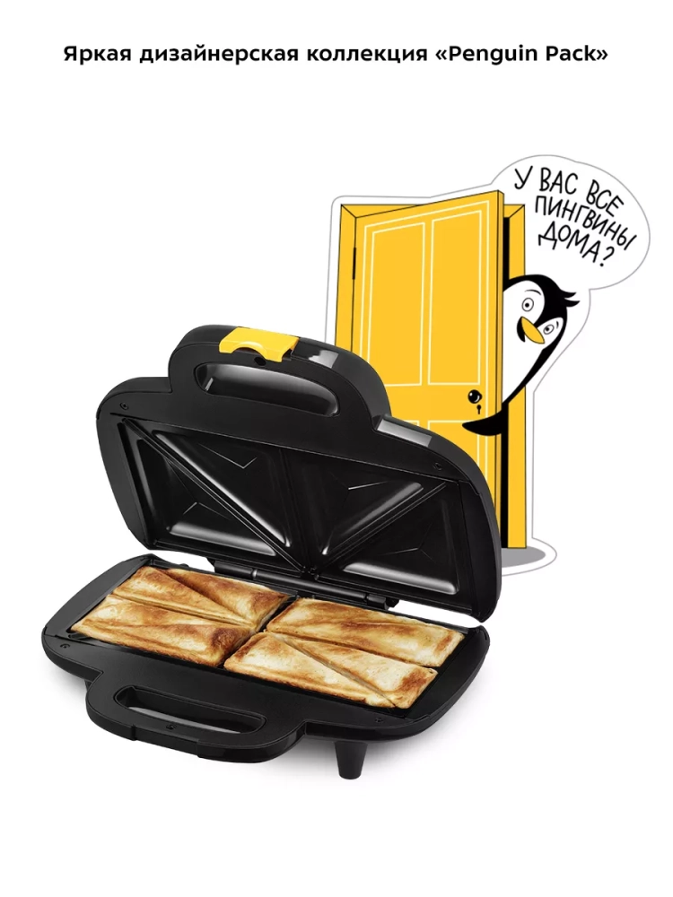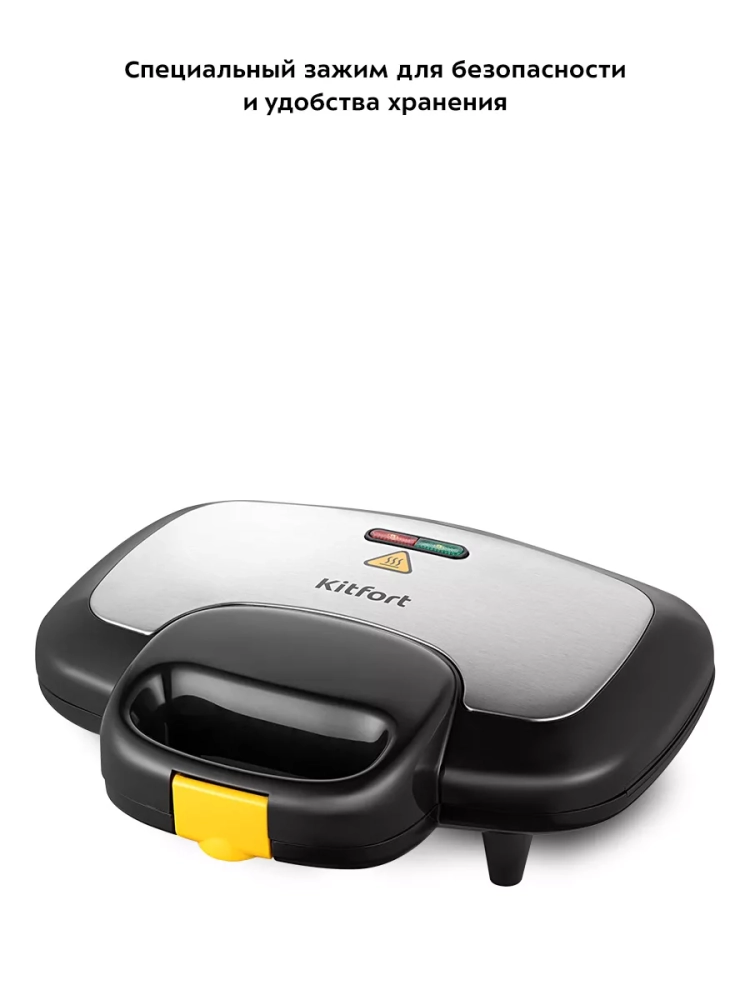 Бутербродница оснащена термостатом для поддержания температуры панелей, а также индикаторами питания и нагрева. Отсек на нижней части корпуса предназначен для удобного хранения шнура питания. Зажим на ручке удерживает крышку бутербродницы в закрытом состоянии, что делает готовку, транспортировку и хранение более удобными.