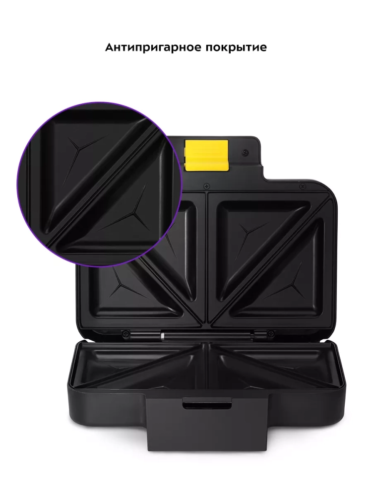 Бутербродница оснащена термостатом для поддержания температуры панелей, а также индикаторами питания и нагрева. Отсек на нижней части корпуса предназначен для удобного хранения шнура питания. Фиксатор на ручке удерживает крышку бутербродницы в закрытом состоянии, что делает готовку, транспортировку и хранение более удобными.