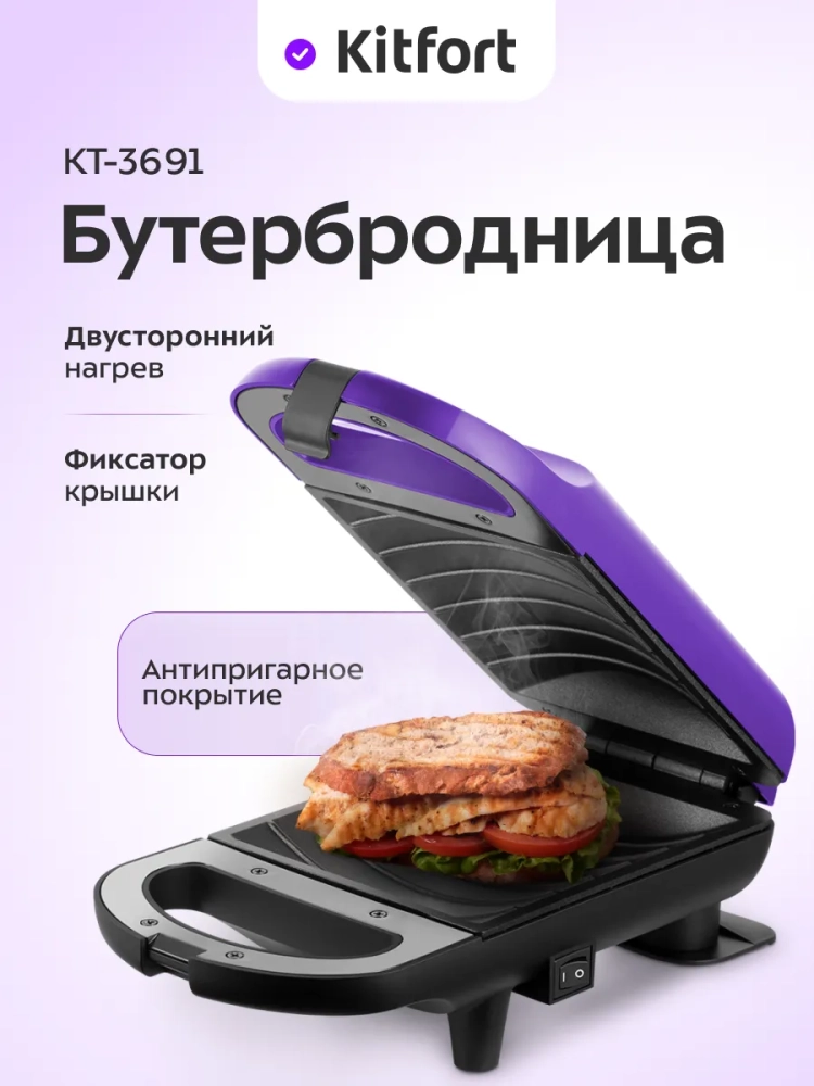В бутерброднице Kitfort КТ-3691 можно поджарить бекон, сосиски, сделать сэндвичи, гренки и бутерброды. Антипригарное покрытие несъемных панелей дает возможность готовить с минимальным количеством масла и не позволяет блюдам прилипнуть к панелям, а также очищать панели намного легче.