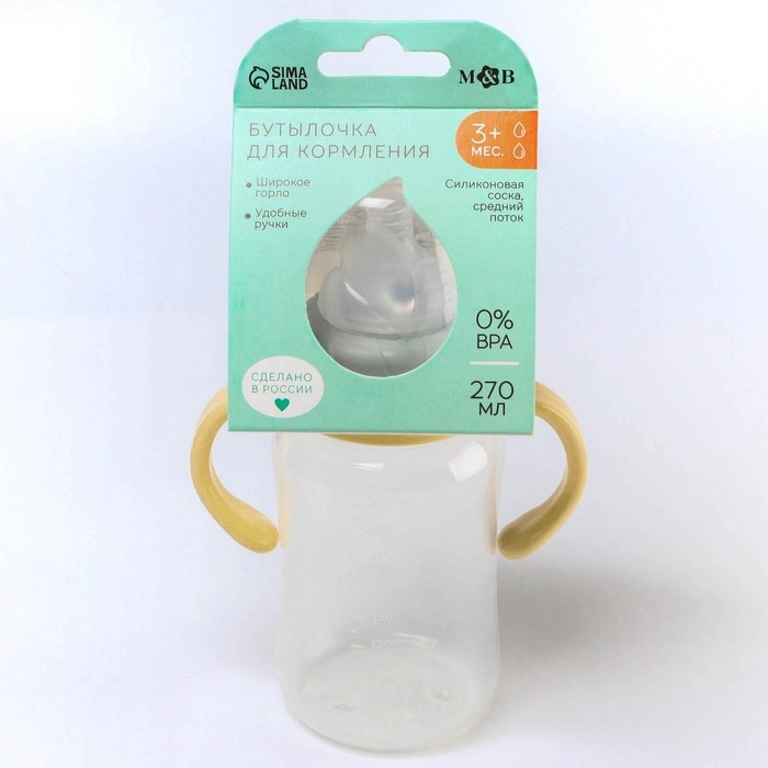 Бутылочка для кормления, широкое горло, 270 мл, с ручками, бежевый/серый