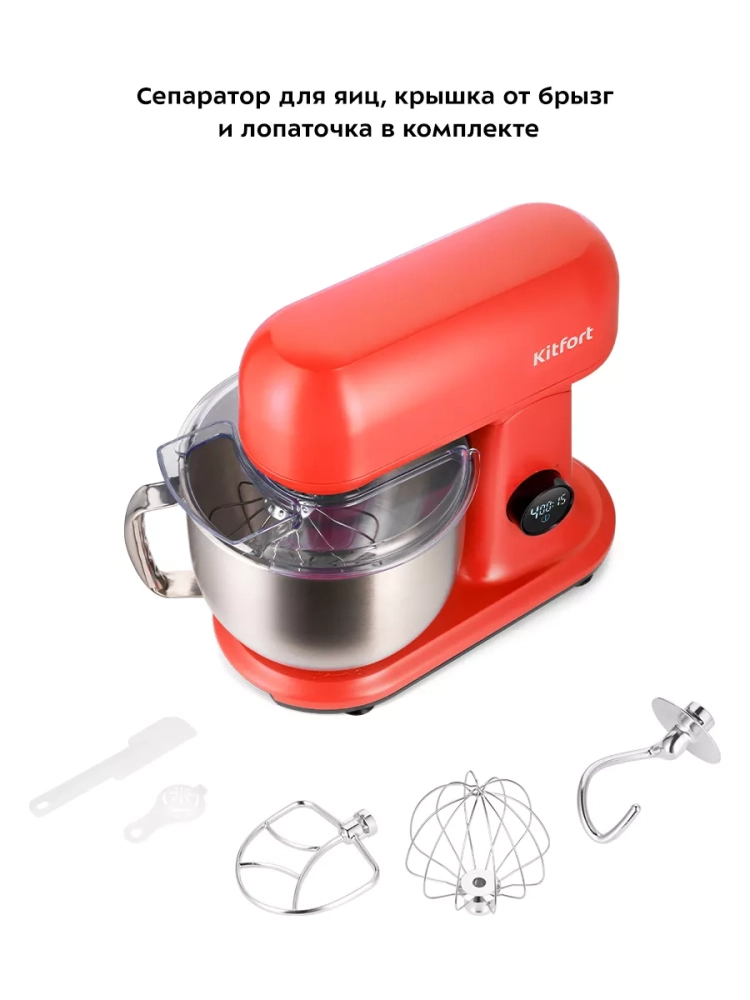 В комплекте идут венчик для взбивания, насадка для смешивания, крюк для замеса крутого теста, а также сепаратор для яиц и лопатка для ручного смешивания и вычищения остатков из чаши.
