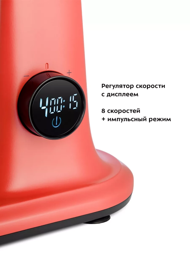 Миксер позволяет плавно регулировать скорость работы. При включении миксера скорость вращения увеличивается постепенно, чтобы предотвратить разбрызгивание ингредиентов. У прибора 8 скоростей. Управление прибором осуществляется регулятором скорости, в который встроен дисплей. На дисплее отображаются: время работы, скорость, кнопка включения и выключения.