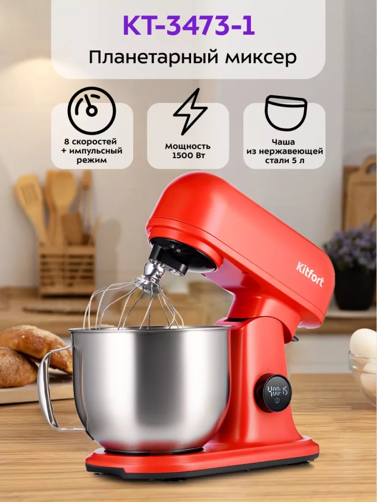 Планетарный миксер Kitfort КТ-3473 поможет вам смешать ингредиенты, взбить яичный белок или сливки, приготовить картофельное пюре, соус, крем, мусс, замесить жидкое тесто для блинов и крутое для пельменей и пирогов.