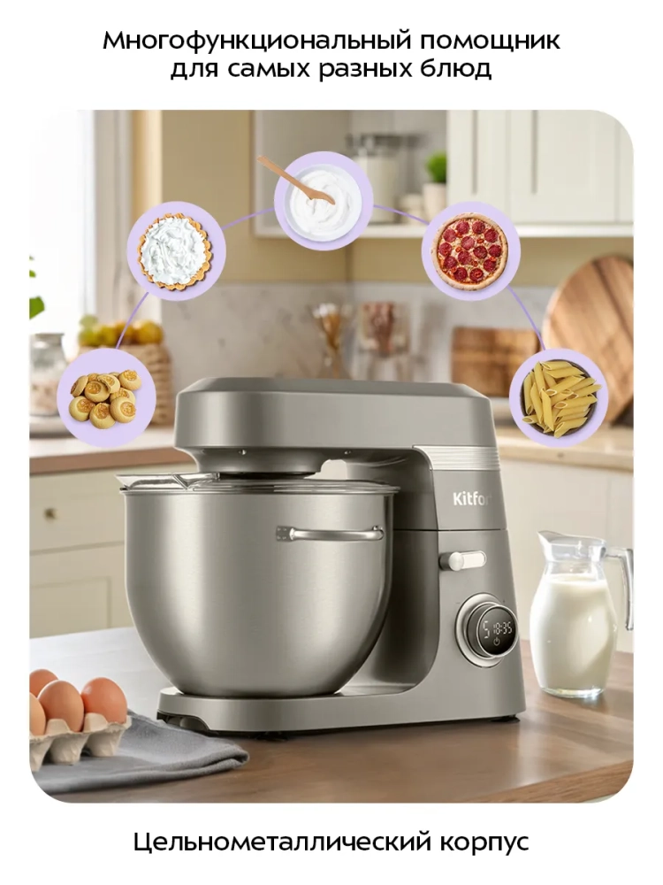 Планетарные миксеры Kitfort — это не просто кухонные приборы, а настоящие тестомесильные машины, которые облегчают процесс приготовления пищи. Стационарный миксер с чашей на 5 литров и мощным двигателем — это идеальное решение для любой кухни. Выбирая миксер Kitfort, вы получаете надежного помощника, который справится с любыми кулинарными задачами.