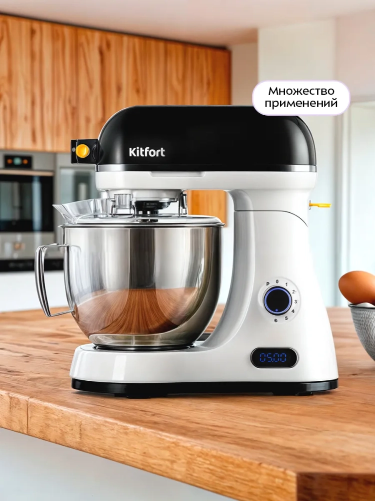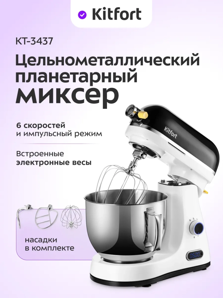 Многофункциональный и мощный цельнометаллический планетарный миксер Kitfort КТ-3437 поможет вам смешать ингредиенты, взбить яичный белок или сливки, приготовить картофельное пюре, соус, крем, мусс, замесить жидкое тесто для блинов и крутое для пельменей и пирогов.