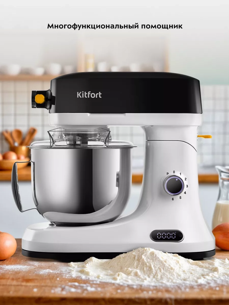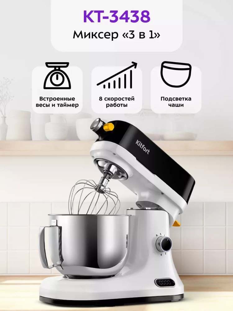 Многофункциональный и мощный цельнометаллический планетарный миксер Kitfort КТ-3438 поможет вам смешать ингредиенты, взбить яичный белок или сливки, приготовить картофельное пюре, соус, крем, мусс, замесить жидкое тесто для блинов и крутое для пельменей и пирогов.