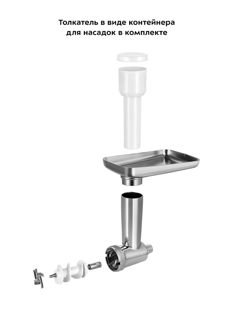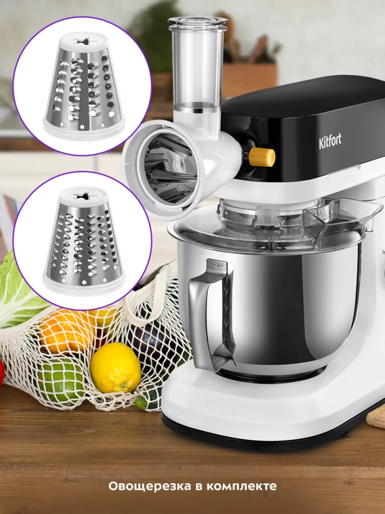 В комплект также входят мясорубка и овощерезка, что превращает миксер в универсальную кухонную машину.