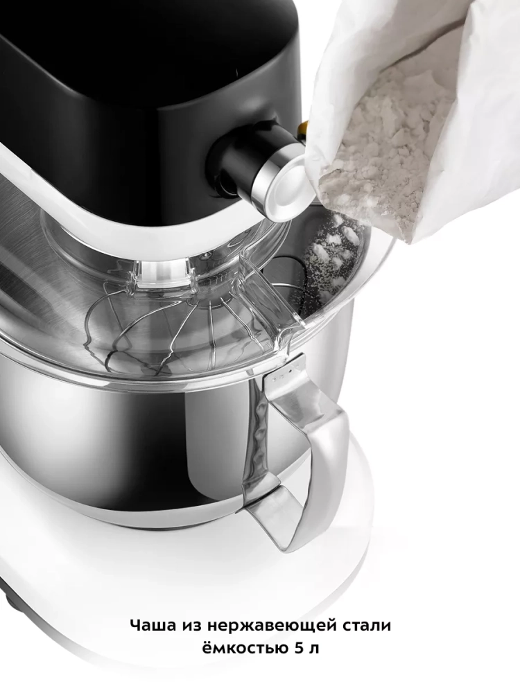 Чаша изготовлена из нержавеющей стали, она прочная и в ней можно смешивать даже горячие ингредиенты. Чаша закрепляется внизу моторного блока и укомплектована защитной крышкой с загрузочным отверстием. Через загрузочное отверстие можно добавлять ингредиенты во время работы, не выключая миксер и не поднимая моторный блок. Крышка выполнена из прозрачного пластика, что позволит вам наблюдать за процессом смешивания.