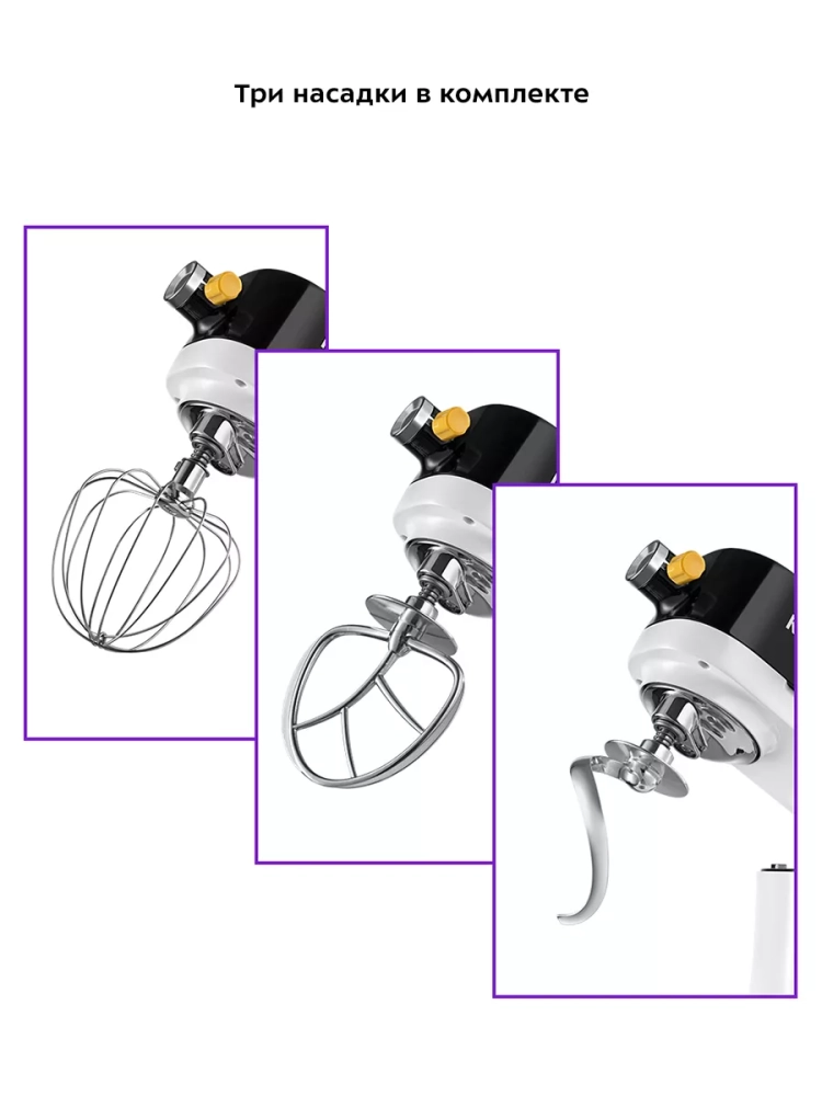 В комплекте к миксеру идут три насадки. Венчик служит для взбивания яичных белков, сливок, замешивания жидкого теста. Насадка для смешивания используется для негустых ингредиентов, приготовления картофельного пюре, томатной пасты, кондитерских смесей, теста для тортов или блинов. Крюк для замешивания подойдет для замешивания густого теста.